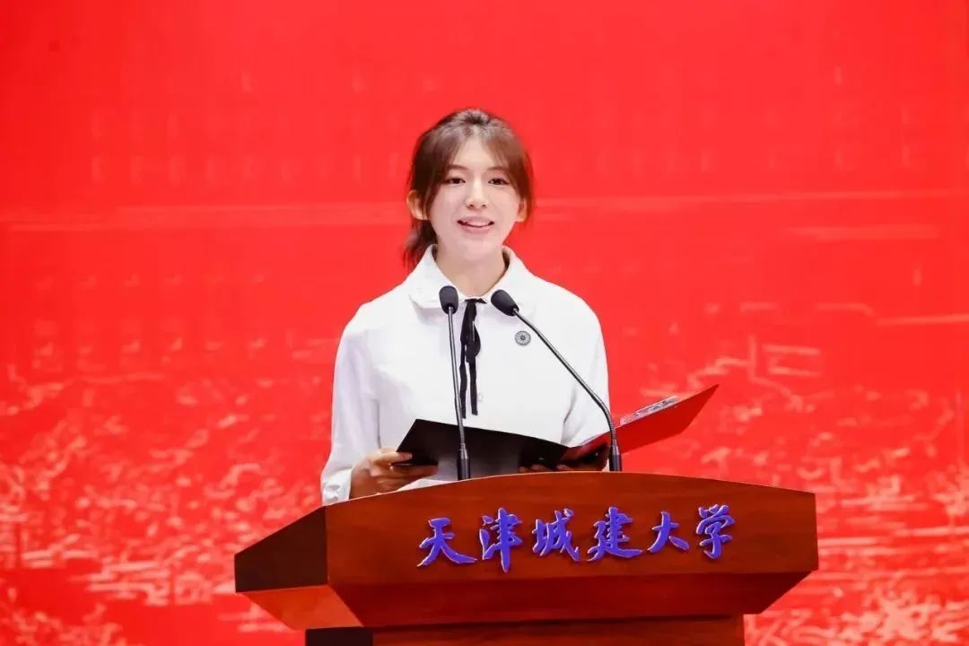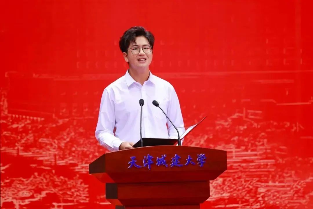 天津市优秀共青团员、天津市“王克昌奖学金”文化科技创新奖、天津市创新创业奖学金获得者、国际工程学院王博远同学作为在校本科生代表进行发言,他用立学、立身、立行三个方面分享了他的天城大故事,鼓励同学们争做眼中有光、勇于开拓、赤诚有爱的天城大青年,在民族复兴的伟大征程中找到自己的青春坐标。
