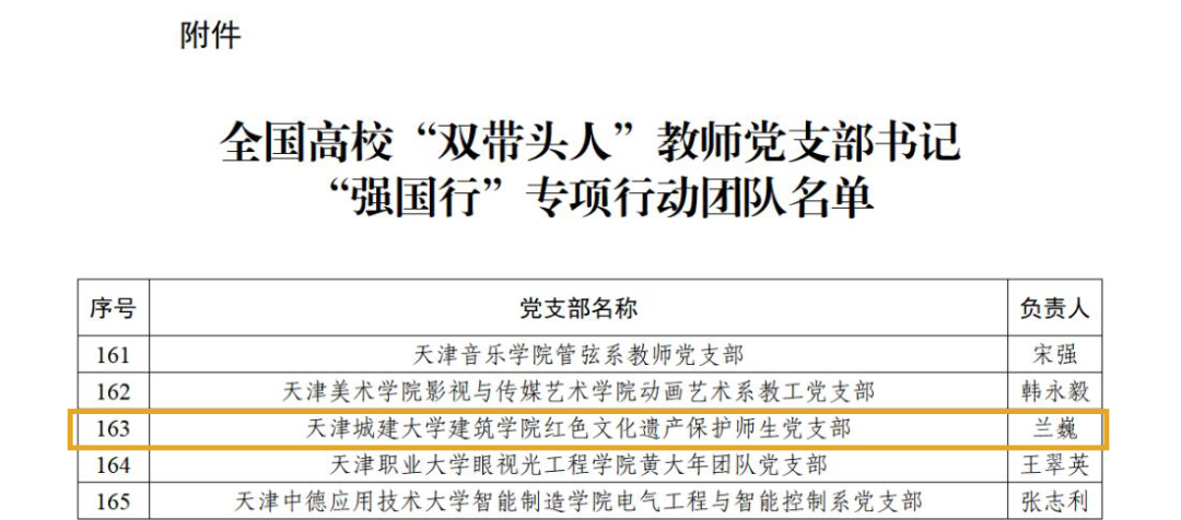 近日,教育部思想政治工作司公布了全国高校“双带头人”教师党支部书记“强国行”专项行动团队名单,伟德官网建筑学院红色文化遗产保护师生党支部成功入选全国专项行动团队。
