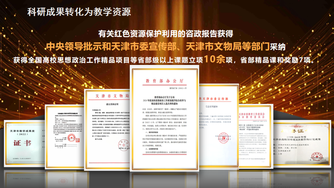 在党支部书记兰巍带领下,支部成员获批教育部高校思想政治工作质量提升综合改革与精品建设项目“天津革命文物建筑数字化保护传承”等科研项目累计11项,主持和参与各类文化遗产保护工程70余项,出版专著《天津百座建筑中的百年党史》,有关红色资源和革命文物保护的咨政报告多次得到重要批示和采纳,获得智库奖和行政科研成果奖。参加天津市红色资源相关机构专业咨询、革命文物审核认定和市人大常委会“一法两条例”执法检查工作。支部书记作为顾问,协助市委宣传部和海河传媒中心做好《小楼春秋·红色记忆》大型纪录片相关工作。参与策划、制作天津市不可移动革命文物展和“革命丰碑——天津市革命遗址展览”,深化革命丰碑展馆“分众化”建设,获批全市干部教育培训现场教学点、天津市科普基地;将文化遗产和红色文化资源转化为教育资源,获批市级课程思政精品课、劳育精品课和一流本科课程累计5门;充分发挥师生共建党支部的融合作用,获省部级以上学生竞赛奖9项;入驻城大“众创空间”创新创业项目1项;师生参加10余项城市更新和历史文化资源挖掘保护项目。