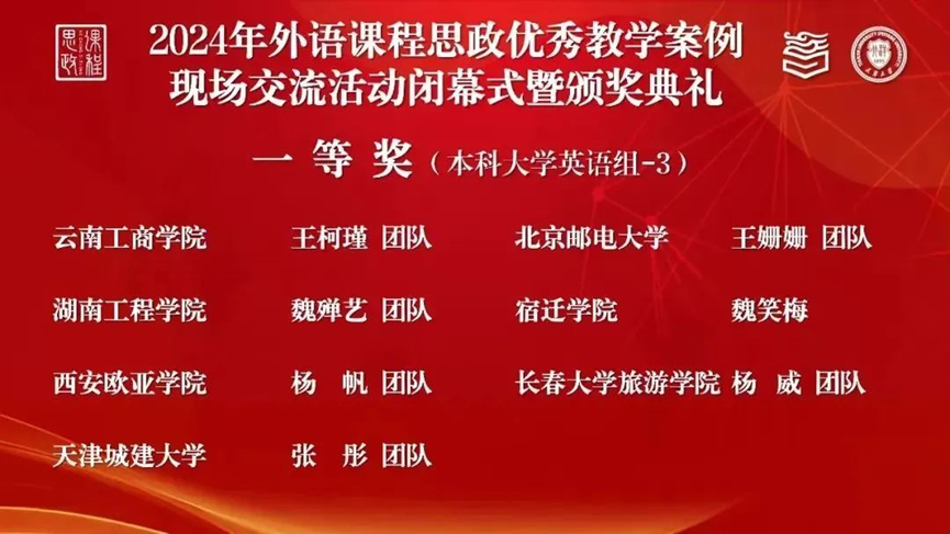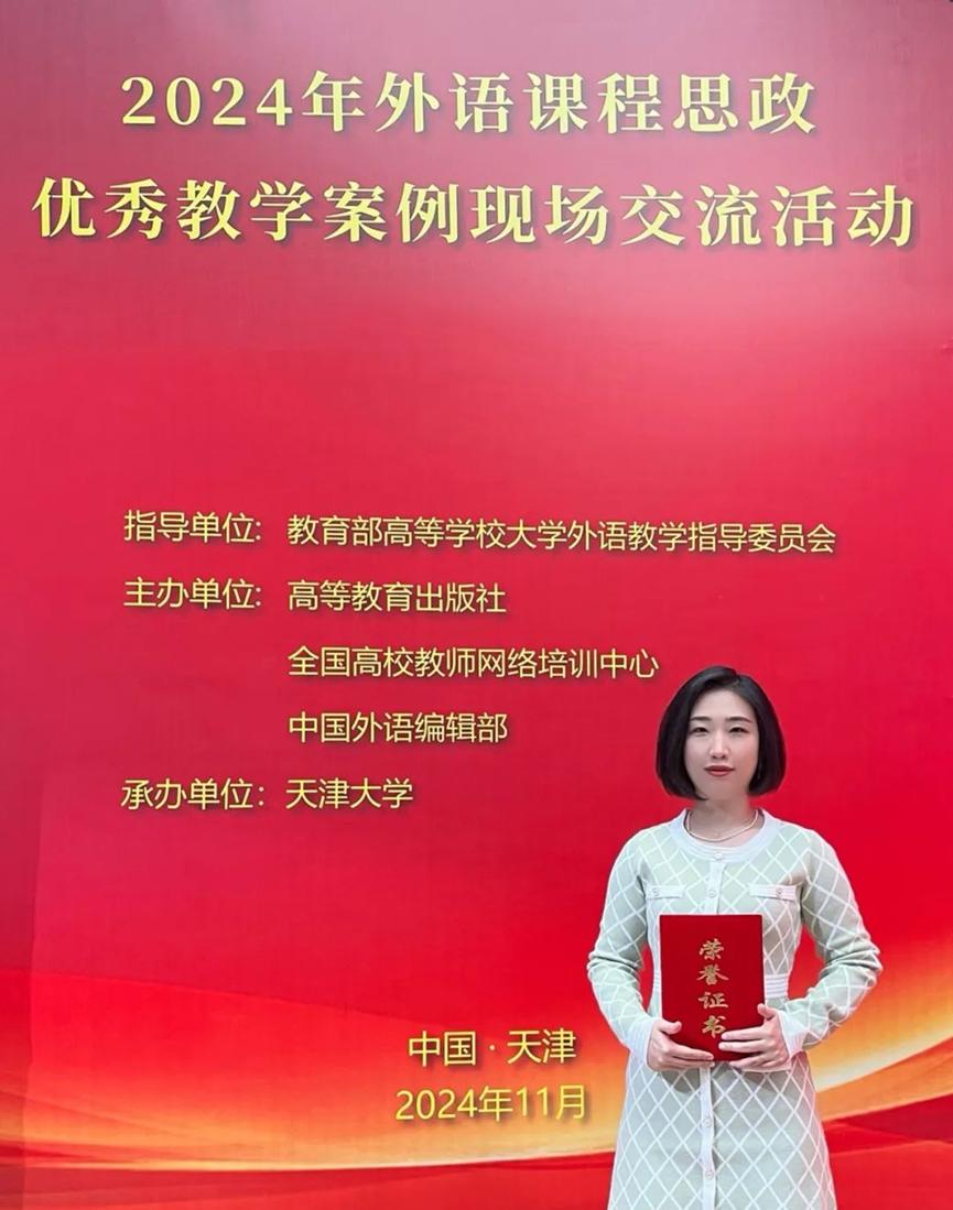 近日,2024年外语课程思政优秀教学案例现场交流活动(以下简称活动)在天津大学顺利落下帷幕。本次活动由教育部高等学校大学外语教学指导委员会指导,高等教育出版社、全国高校网络培训中心和中国外语编辑部主办。伟德官网外国语学院张彤教师团队(张彤、时园园、朱姗、甘莹)荣获国赛一等奖。