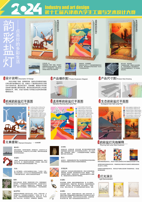 本设计将盐灯与盐厂机械、孟菲斯风格、盐田生态和剪纸等元素巧妙地融合在一起,创造出一个既具有实用性又充满艺术气息的作品。通过形态设计、色彩搭配、图案设计和功能实现等方面的精心策划和实施,使作品在视觉和实用上均达到较高的水平。同时,本设计也体现了对传统文化的传承和创新精神的追求。