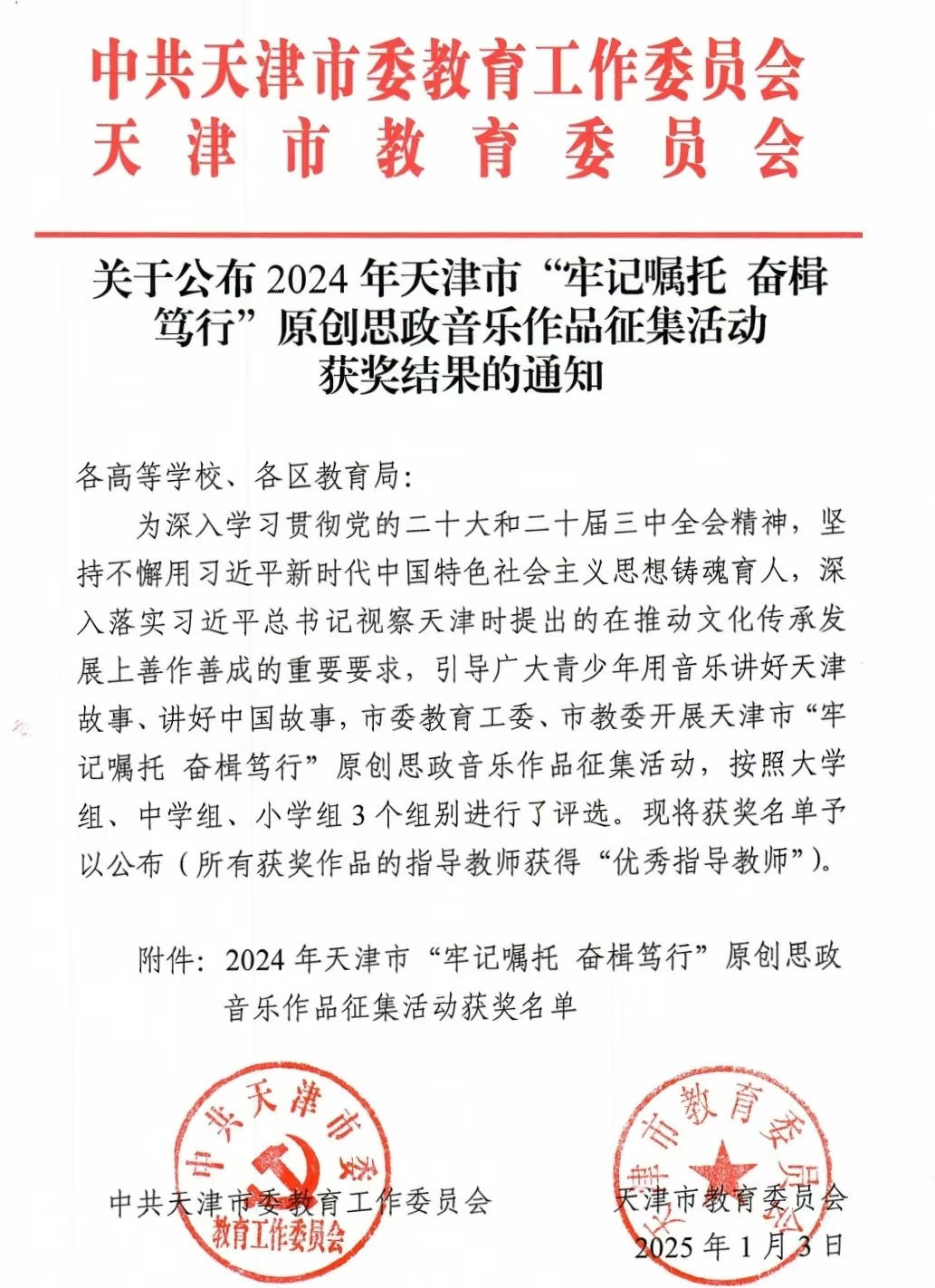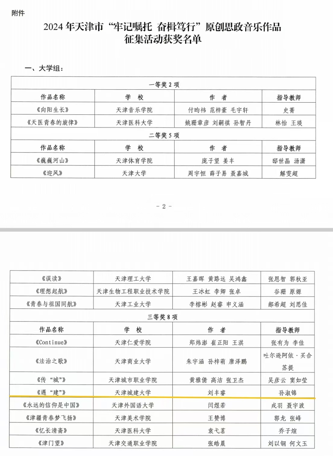 为深入学习贯彻党的二十大和二十届三中全会精神,坚持不懈用习近平新时代中国特色社会主义思想铸魂育人,深入落实习近平总书记视察天津时提出的在推动文化传承发展上善作善成的重要要求,引导广大青少年用音乐讲好天津故事、讲好中国故事,市委教育工委、市教委开展天津市"牢记嘱托奋楫笃行"原创思政音乐作品征集活动。由伟德官网团委孙淑锦老师指导,国际教育学院刘丰睿同学创作的歌曲《遇“建”》获大学组三等奖。