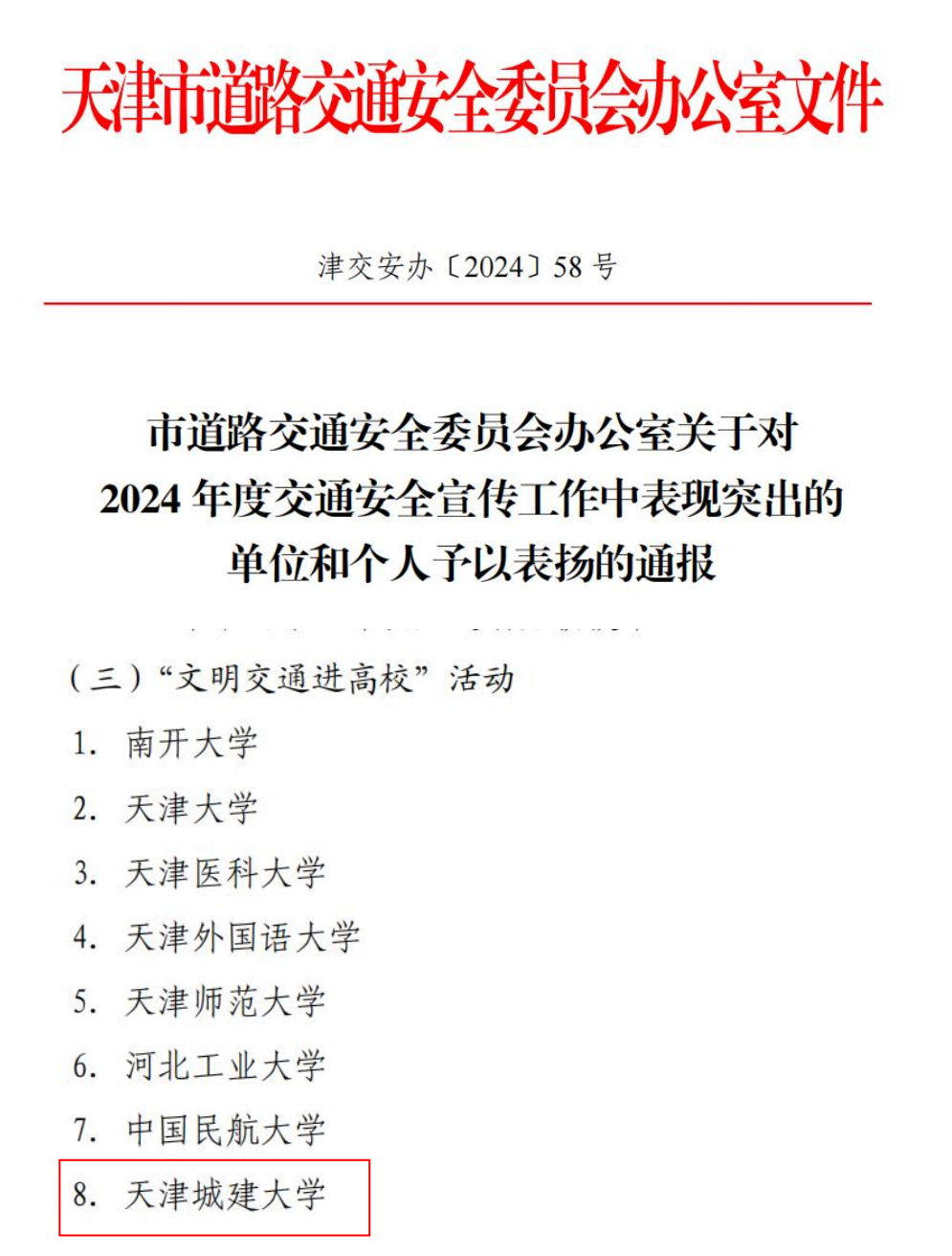 近日,在由天津市教育委员会、天津市文明办、共青团天津市委员会、天津市公安交通管理局等部门组织开展的2024年度“文明交通进高校”活动中,伟德官网获评“文明交通进高校”活动优秀高校。