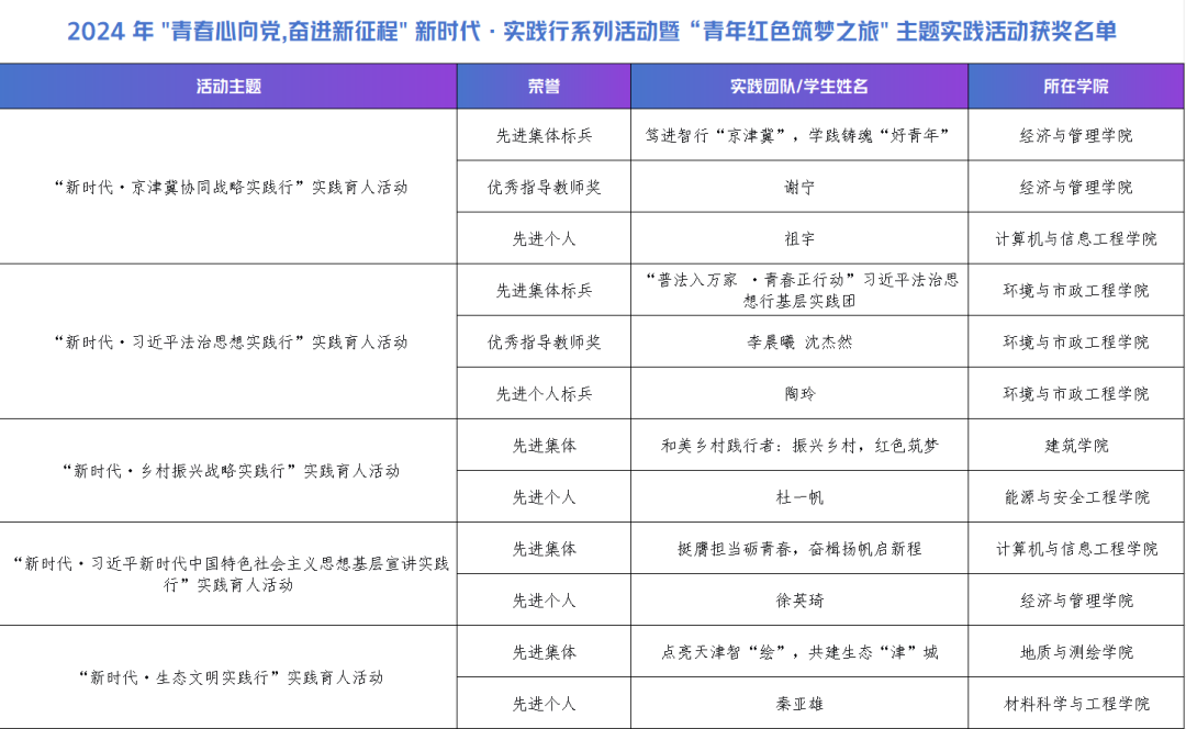 近日,市教育两委公布2024年“青春心向党,奋进新征程”新时代·实践行系列活动暨“青年红色筑梦之旅”主题实践活动评审结果,伟德官网师生荣获“新时代·乡村振兴战略实践行”“新时代·习近平新时代中国特色社会主义思想基层宣讲实践行”“新时代·京津冀协同战略实践行”“新时代·生态文明实践行”和“新时代·习近平法治思想实践行”全部5个主题方向的先进集体和先进个人,并荣获2项“先进集体标兵”、2项“优秀指导教师”、1项“先进个人标兵”和1项“优秀组织单位”荣誉称号。