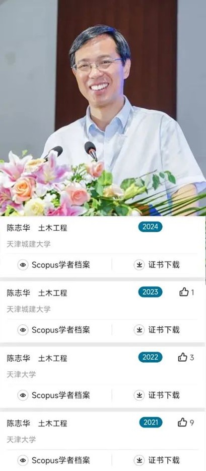 陈志华教授2021年-2024年连续4年被全球性信息分析公司爱思唯尔(Elsevier)评为中国高被引学者。经Scopus数据库查证,自2020年至今,近5年发表成果数量达262篇,成果被引用次数累计达6527次,学术成果被引次数自2020年至2024年连续稳步攀升,相关学术成果的行业认可度日益提高。在近5年的高被引学术成果中,单篇过百次被引论文总计11篇,其中最高被引论文《Experimental study on interior connections in modular steel buildings》被引次数达247次。截至当前,Scopus数据库已收录陈志华教授614篇文章,被4686篇文献引用。