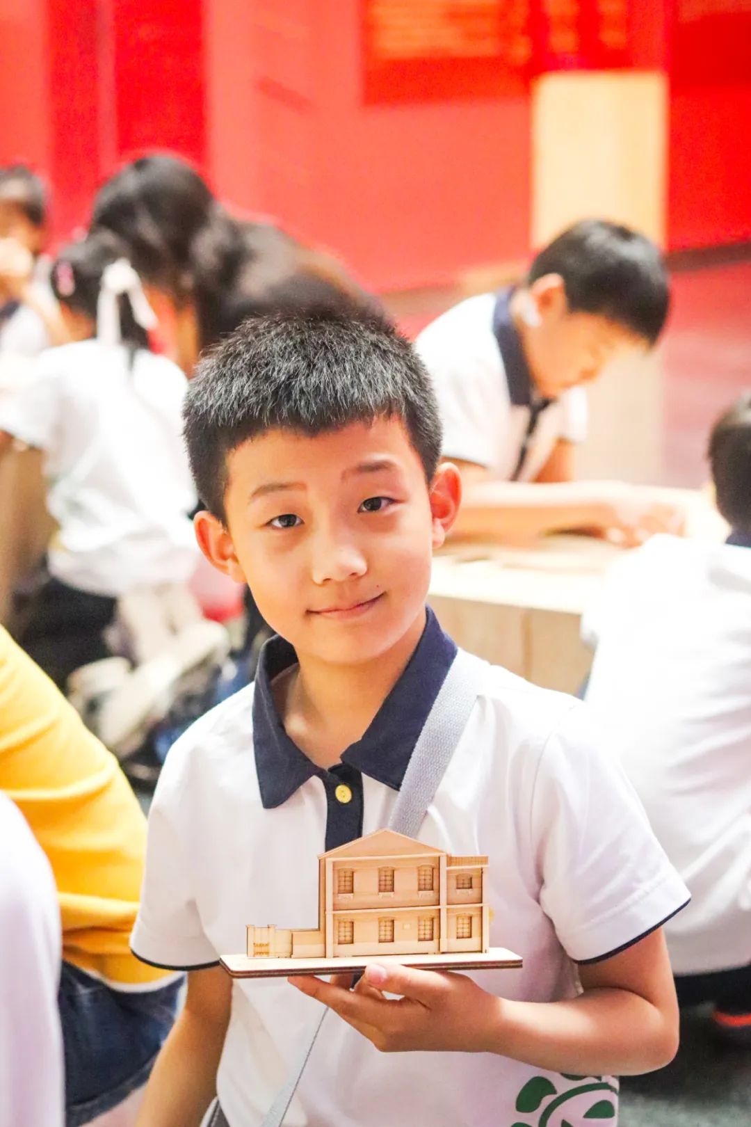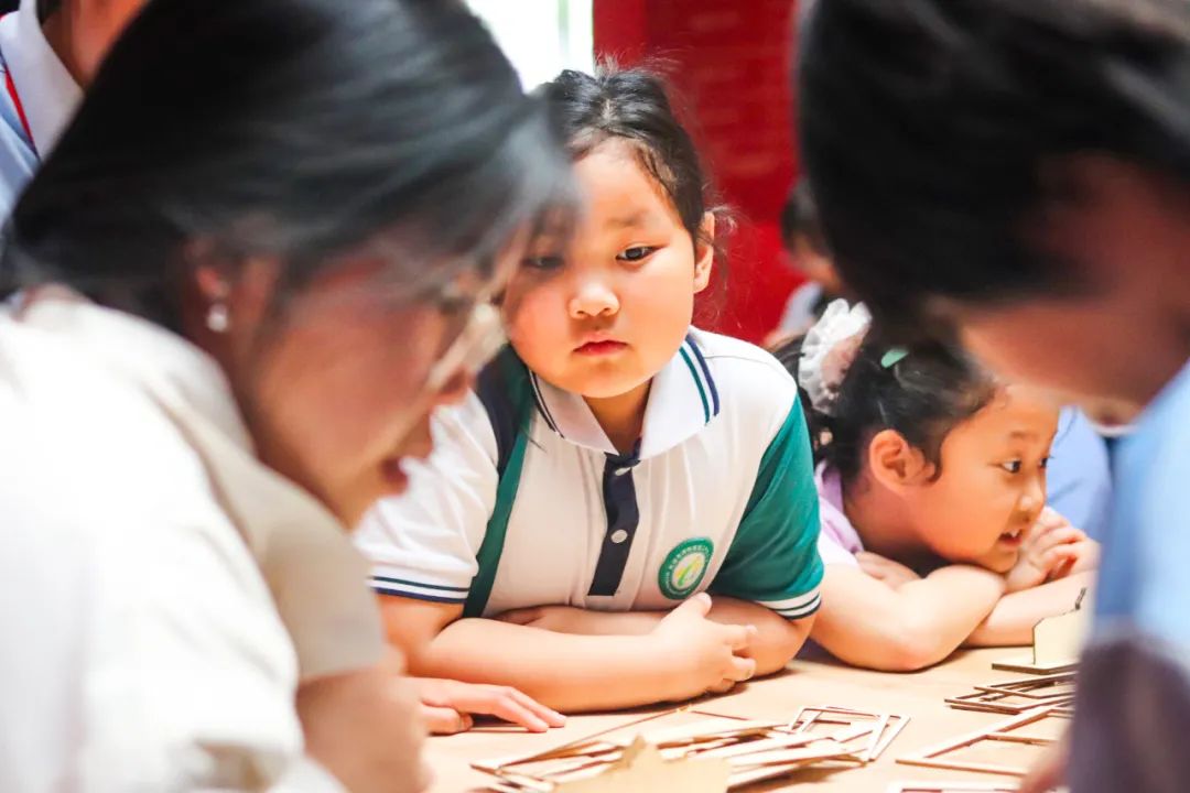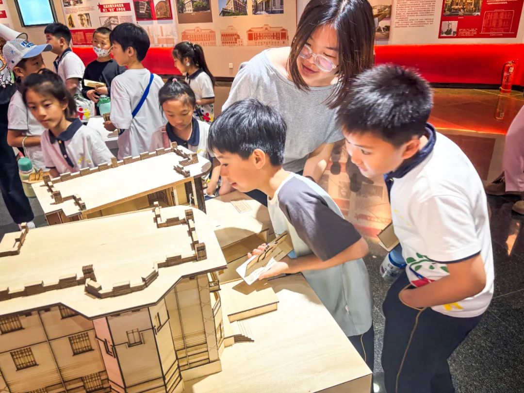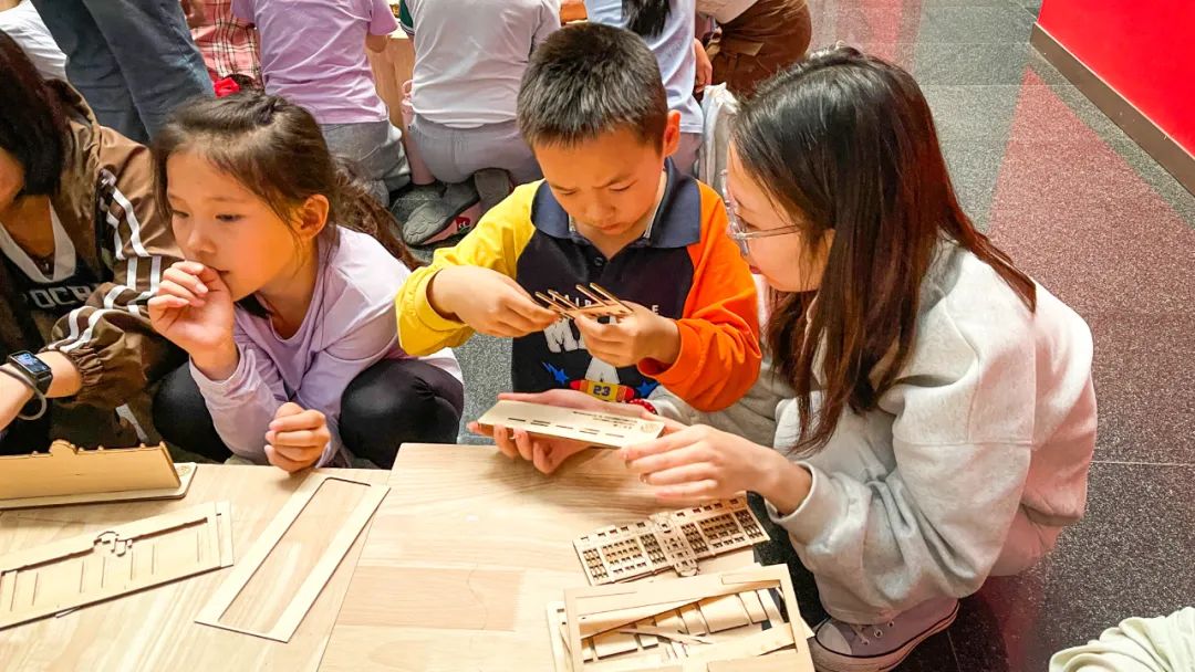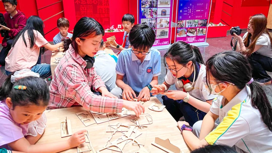 在革命历史建筑木工模型智趣拼构环节中,科普基地志愿者们一对一辅导小学生动手实操,与他们共同探究以革命历史建筑为元素进行建筑艺术转译与再现的过程,使他们在获得红色文化遗产保护相关知识的同时,获得动手与表达、艺术与创新的成就感和满足感。趣味的动手实操形式、精致的拼构模型巧思激发了小学生们的实践热情,他们津津有味地与科普志愿者师生研究着模型构件的拼插方法、交流着自己的拼构体验、讨论着观摩木工模型设计和制作工艺的心得,对革命历史建筑充满好奇心和想象力。
