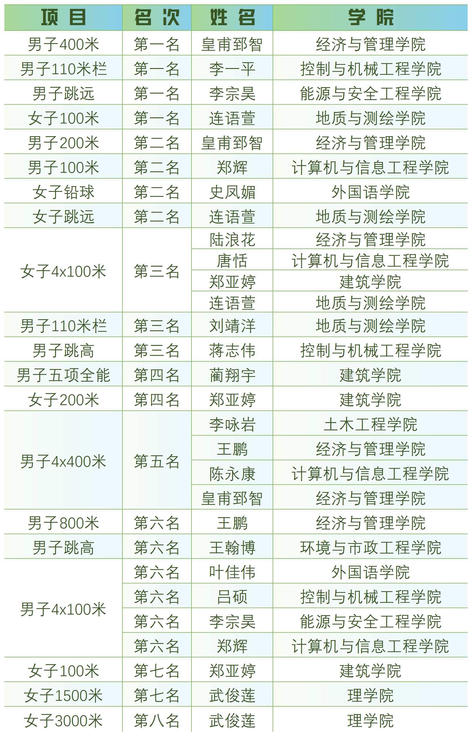 在5月16日至18日于天津财经大学举行的第十六届天津市大学生田径冠军赛中,天城大学子奋勇争先、团结协作,成功斩获4项冠军、4项亚军、3项季军,创造了学校在该项赛事中的历史最佳纪录。