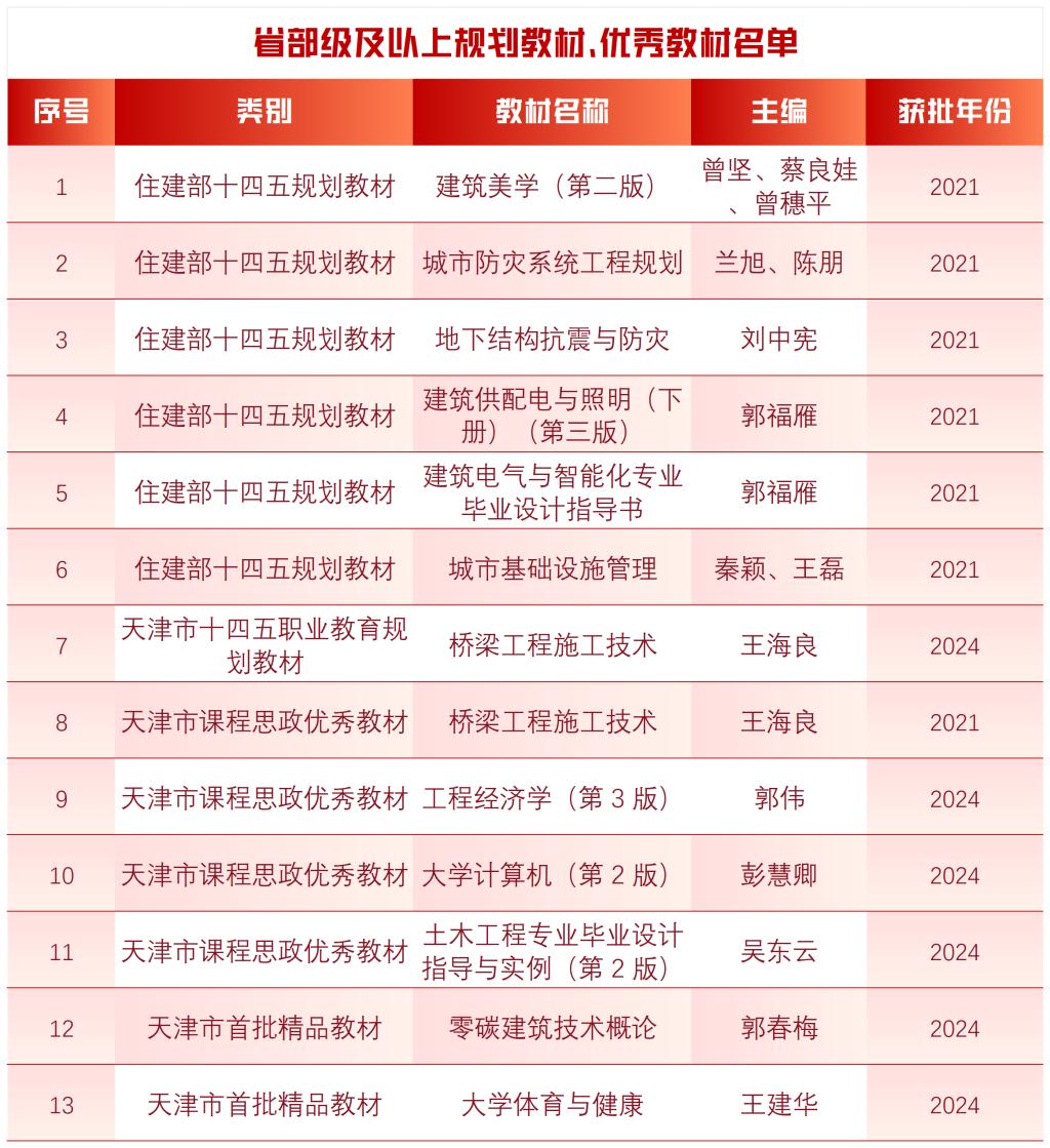 成立“1+17”立体化课程思政矩阵——设立校级教学研究中心,联动17个教学单位分中心,选树9个标杆示范中心,实现课程思政全覆盖。建筑工程系获评首批天津市级普通高校优秀基层教学组织。累计建成教育部及市级示范课程25门、市级优秀教材4种及故事思政微课大赛课程思政组特等奖1项,斩获教育部、市级高校思政工作精品项目24项,领跑全市高校。首创“以红色建筑讲述地方党史”新模式,依托革命丰碑展馆、红色文化遗产研究院,将百年建筑转化为沉浸式党史课堂,获批天津市红色文化遗产保护科普基地等5个基地。