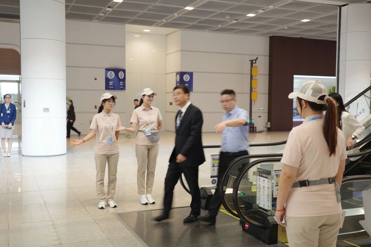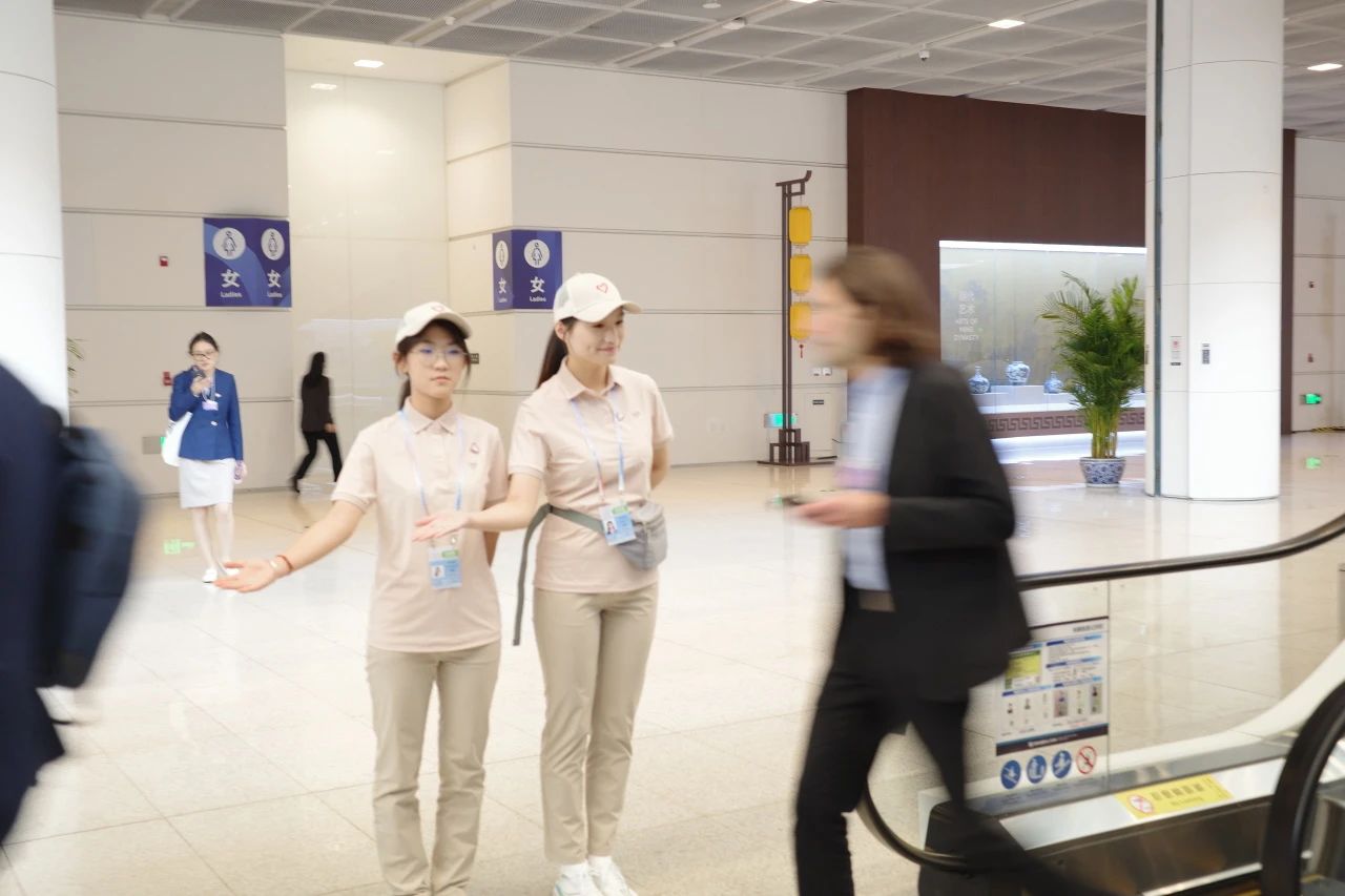 在媒体村附近,志愿者们以“双岗双责”模式高效运转,在电梯出入口进行定点执勤,疏导人流、维持秩序,深度融入文化之夜活动的服务保障体系,为中外宾客提供精准的路线指引与活动介绍。