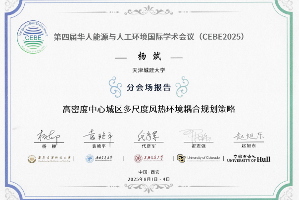 会上,杨斌教授在专题研讨34“碳中和与计算性设计”中作了题为《高密度中心城区多尺度风热环境耦合规划策路》的专题报告,并担任专题研讨38“人工智能技术在智能建筑环境中的设计、建造与维护”的分会场主席。刘敏章副教授在专题研讨46“建筑通风、节能与火灾防护策略”中做题为《地铁隧道火灾通风排烟技术实验研究》的专题报告。范敏超老师做题为《区域建筑综合能源多能联储方案多属性决策及容量优化配置》的口头报告。