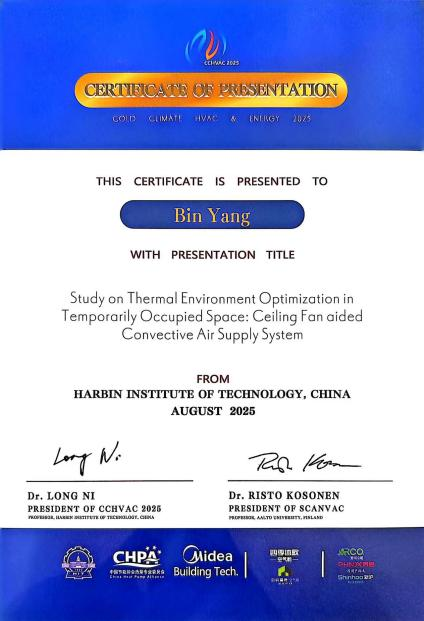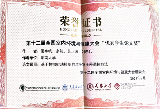 伟德官网能源与安全工程学院院长杨斌教授受邀参会并在“睡眠环境与健康”分会场做题为《睡前干预与睡中环境智能营造研究初探》的邀请报告,在“AI+环境”分会场作了题为《人因技术在建筑环境领域的应用》的邀请报告。常宇帆老师在“优秀论文奖及室内环境设计竞赛答辩”分会场中,汇报了《基于数据驱动模型的洁净室压差调控方法》的研究成果。针对洁净室压差稳态偏离与动态调控难题,基于方差分解的Sobol全局敏感性分析方法,识别了稳态与动态扰动情景下,压差偏离的主导因素,优化了系统压差精细调试技术,提出了基于前馈控制的PID动态快速调控技术,显著提升了系统整体的稳定性与响应效率。该研究对保障受控区域的工艺过程、产品质量与人员健康具有重要的理论价值与工程应用意义,最终在激烈竞争中荣获优秀论文奖。