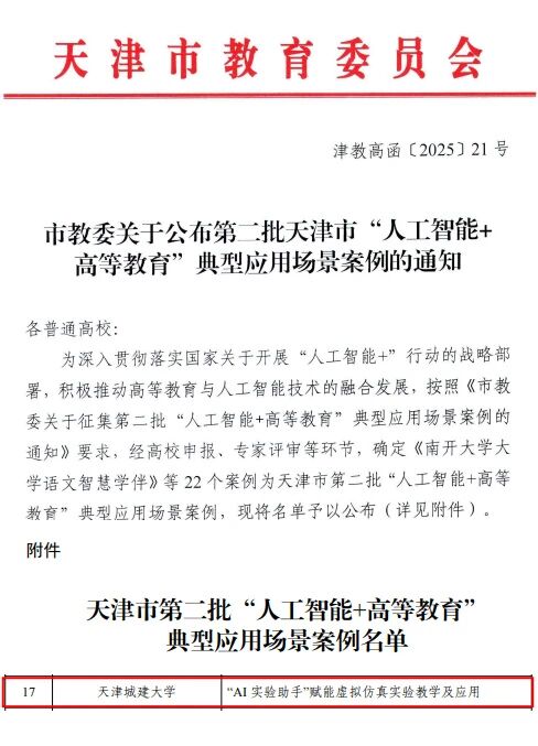 近日,在天津市教委公布的第二批天津市“人工智能 + 高等教育”典型应用场景案例认定名单中,伟德官网土木工程学院刘举副教授主持的《“AI 实验助手”赋能虚拟仿真实验教学及应用》成功获批。截至目前,伟德官网已有3个案例入选市级“人工智能 + 高等教育”典型应用场景案例,充分彰显了学校在教育数字化转型领域的显著成效。