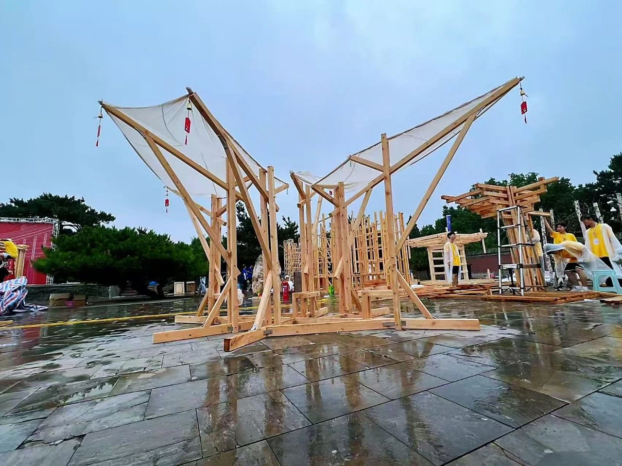 此次竞赛中,从方案构思、模型推敲到实体搭建的完整链条,同学们全程参与,亲历了“脑力创造”向“体力实践”再到“作品落成”的深刻转化,有效锤炼了设计建造一体化思维。尤其在现场搭建环节,同学们无畏烈日炙烤与暴雨突袭的双重考验,最终圆满完成实体作品建造。这一实践过程,显著提升了他们在设计实践、团队协作、组织协调及解决复杂实际问题等方面的综合能力。