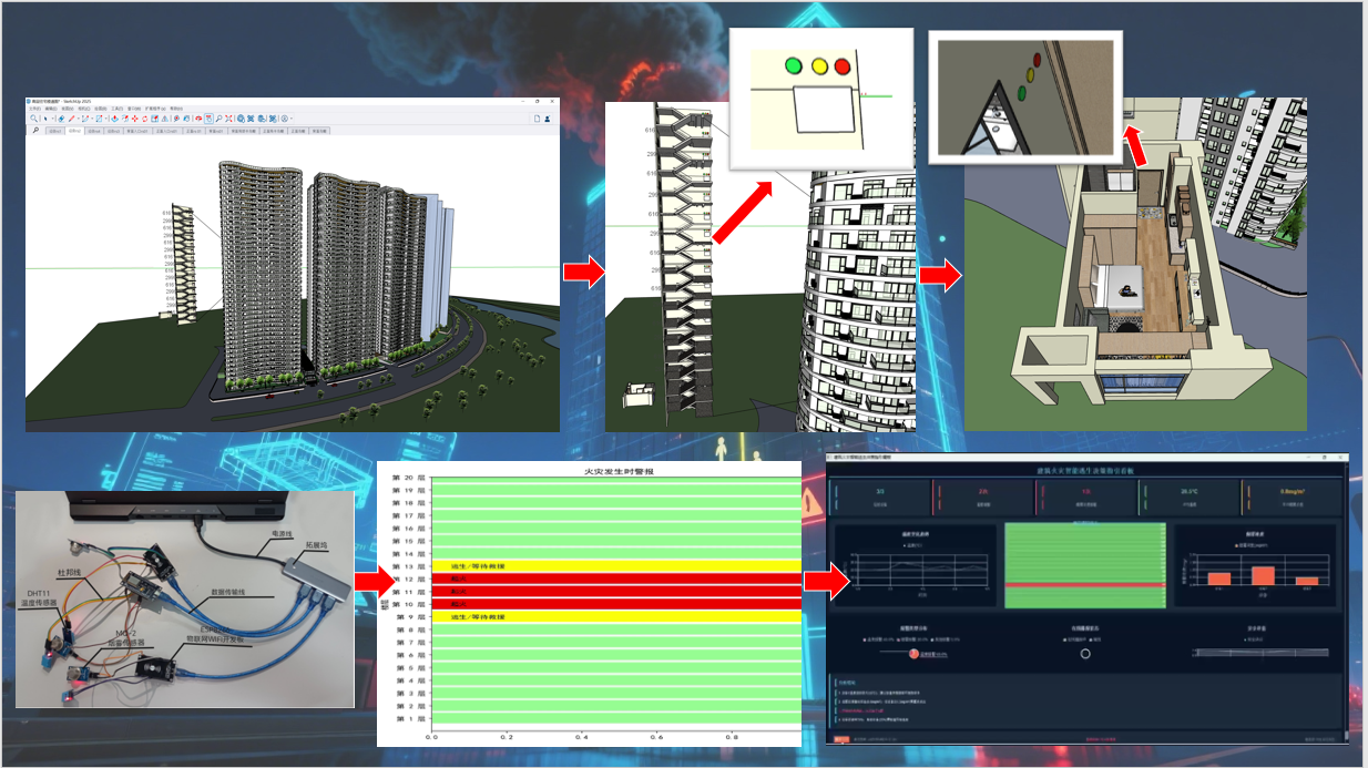 据全国火灾形势报告显示,住宅火灾相对多发且伤亡最为惨重,伤亡人数占总数的92%。主要原因是受困居民缺少对实时火情火势信息的掌握,盲目逃生。故本项目基于动态火场分布信息采集技术,解决火场信息滞后的痛点,设计研发了一种新型的建筑火灾智能逃生决策指引系统。本系统具有火场烟雾浓度、温度动态采集直显功能,经数据处理形成楼宇内部火灾风险动态分级警示图以及分区逃生方案,辅助用户进行主动决策逃生。本作品注重动态感知与智慧指引,响应国家智慧安全战略,推动社区精准应急建设,助力提高消防工作的专业化、智能化、精细化水平。