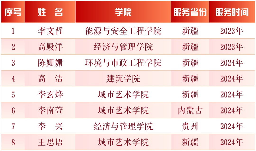回首征程,每一寸足迹都浸润着组织的关怀与扶持;眺望前方,炽热的理想如胡杨般扎根边疆沃土。西部计划不仅是青春的试金石,更是新时代青年与祖国同频共振的庄严承诺。一直以来,学校高度重视西部计划工作,至今已有近100名大学生志愿者奔赴祖国中西部地区,为当地经济社会发展贡献青春力量。今后学校将持续加大志愿者招募选拔培养力度,深化大学生就业引航,引导青年学生共同绘就乡村振兴的壮美画卷,让青春之花在祖国最需要的地方绚丽绽放。
