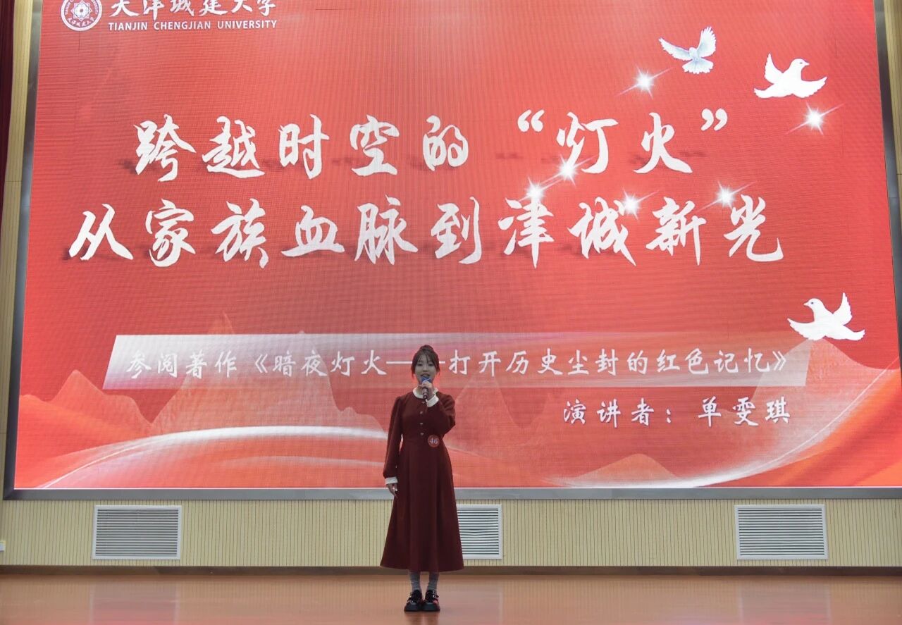 单雯琪同学以《跨越时空的“灯火”,从家族血脉到津城新光》为演讲主题,参阅著作《暗夜灯火——打开历史尘封的红色记忆》。她结合真实经历和切身感受,以极富感染力的演讲抒发对信念的坚守、对家国的热忱,把青春融入祖国的山河,用行动礼赞不朽的丰碑,深深打动着在场的评委与观众,展现出伟德官网学子昂扬向上的精神面貌和拼搏精神。