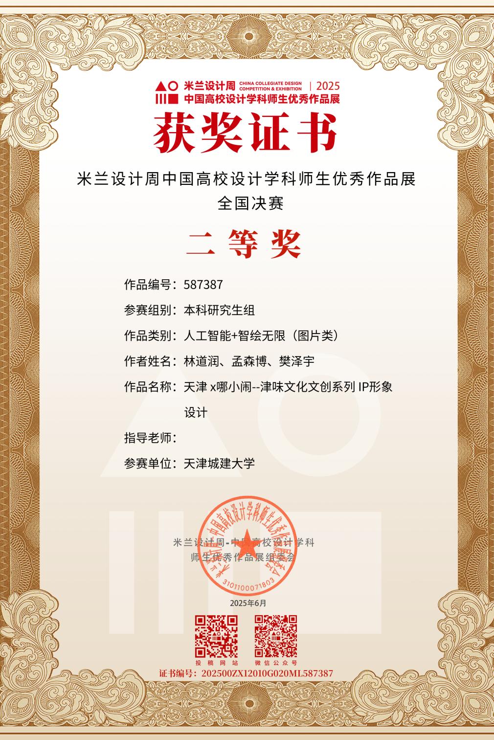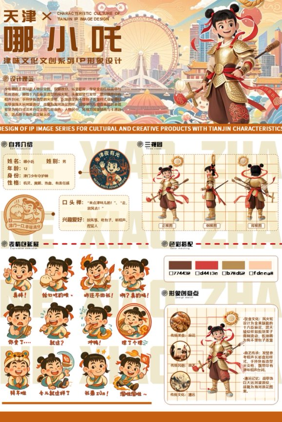 设计以神话人物“哪吒”为原型,融合天津三大文化基因——饮食、曲艺与漕运记忆,塑造出一位兼具童真、英气与烟火气的城市守护童神“哪小吒”。形象设计中,十八街麻花作风火轮、包子蒸笼演绎为乾坤圈、火尖枪融入快板元素,勾勒出既富中国风韵、又洋溢津门特色的视觉符号体系。借助AI生成工具高效拓展角色场景与风格演绎,探索“人工智能+设计”的创新路径,回应新质生产力背景下文化表达的革新需求。作品延伸至明信片、表情包、墙绘及衍生品等多种载体,构建出可传播、可共创的城市文化IP生态,以设计激活文化,以科技赋能创意,展现中华优秀传统文化在数字语境中的转化与生长。