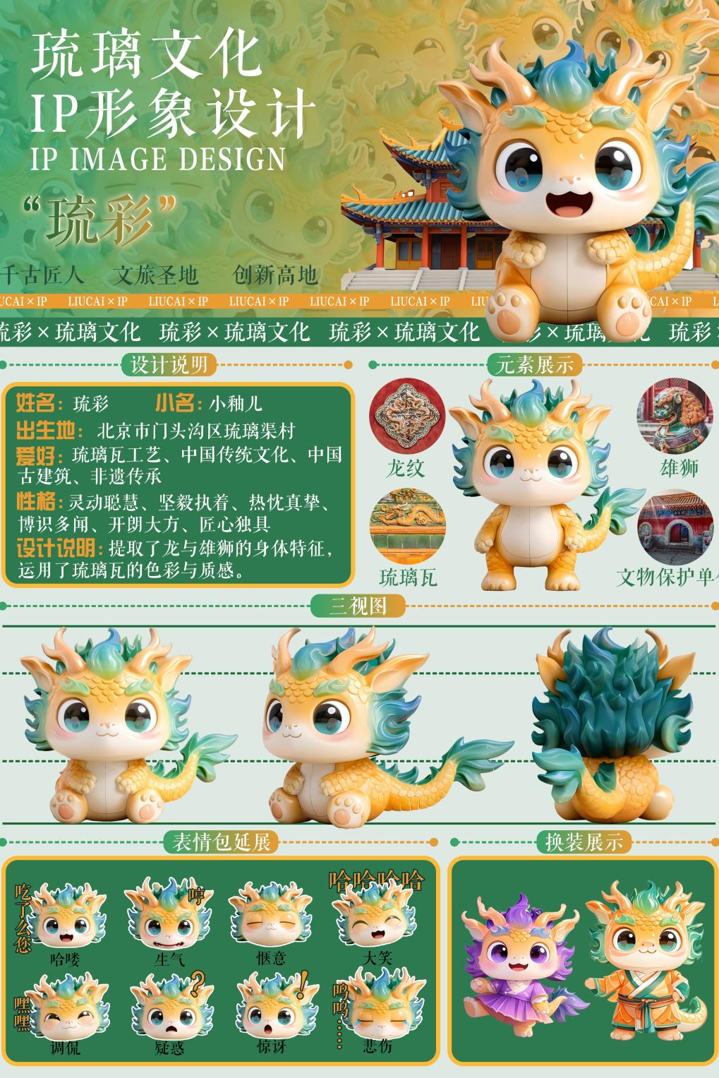 作品根植于北京琉璃渠村六百年琉璃烧造非遗技艺,从中提炼“龙”与“雄狮”两大文化符号,构筑出具有中国审美意蕴的IP形象——“琉彩”。造型上巧妙融合龙的蜿蜒灵动与狮的庄重威严,形体线条圆润饱满,兼顾卡通化表达,符合当代年轻人的审美趣味。其表面施以明黄、青绿等传统琉璃瓦釉色,再现古建琉璃独有的色彩渐变与晶莹质感,既承古韵,亦见新意。秉持“传统工艺活化”理念,“琉彩”IP不止步于形象塑造,更注重实用转化。通过设计开发系列钥匙扣、文具、潮玩等文创衍生品,将凝固于殿宇之上的琉璃艺术,转化为可触摸、可佩戴、可收藏的生活美学。