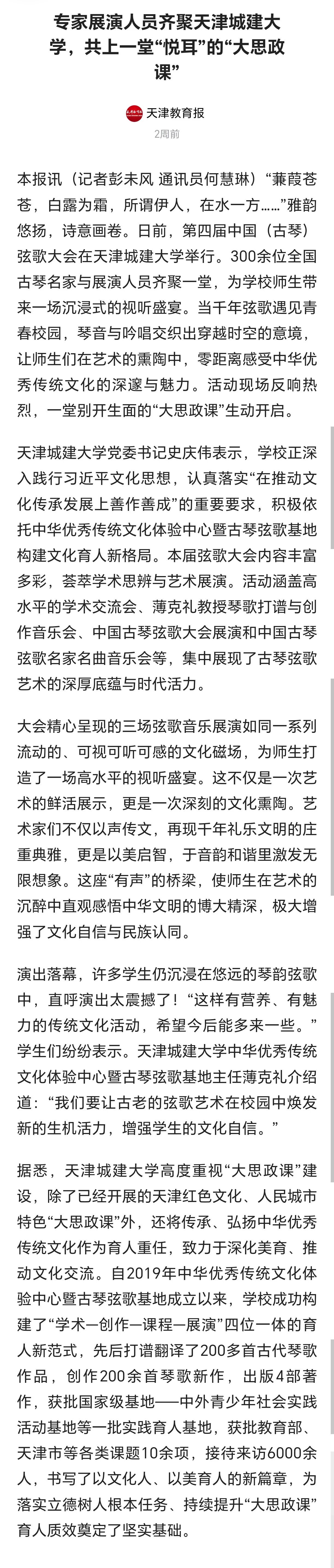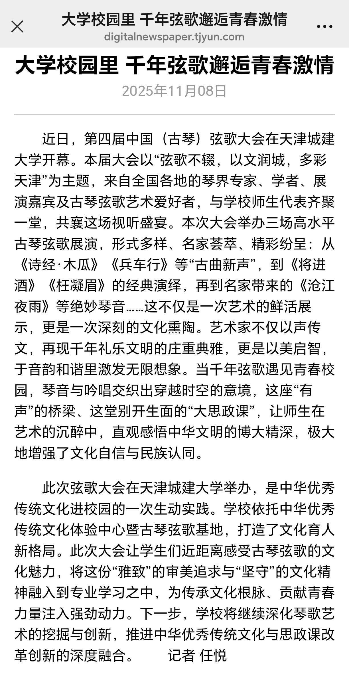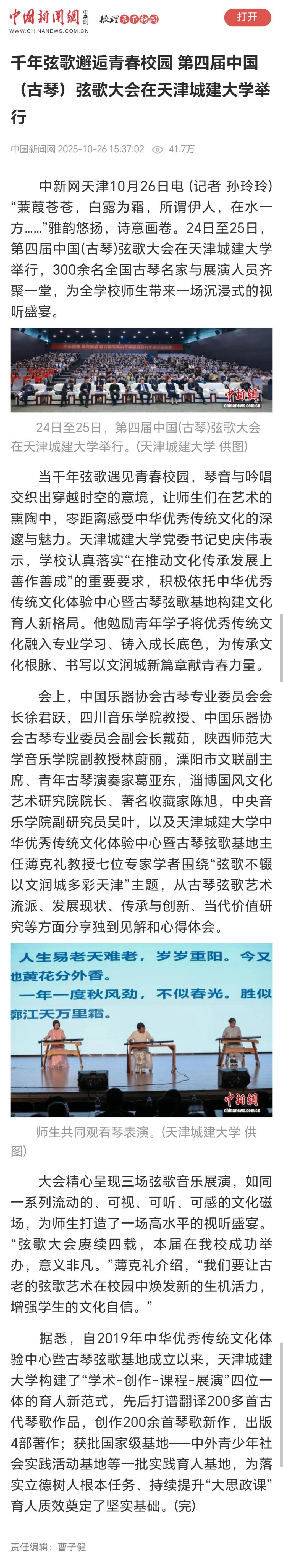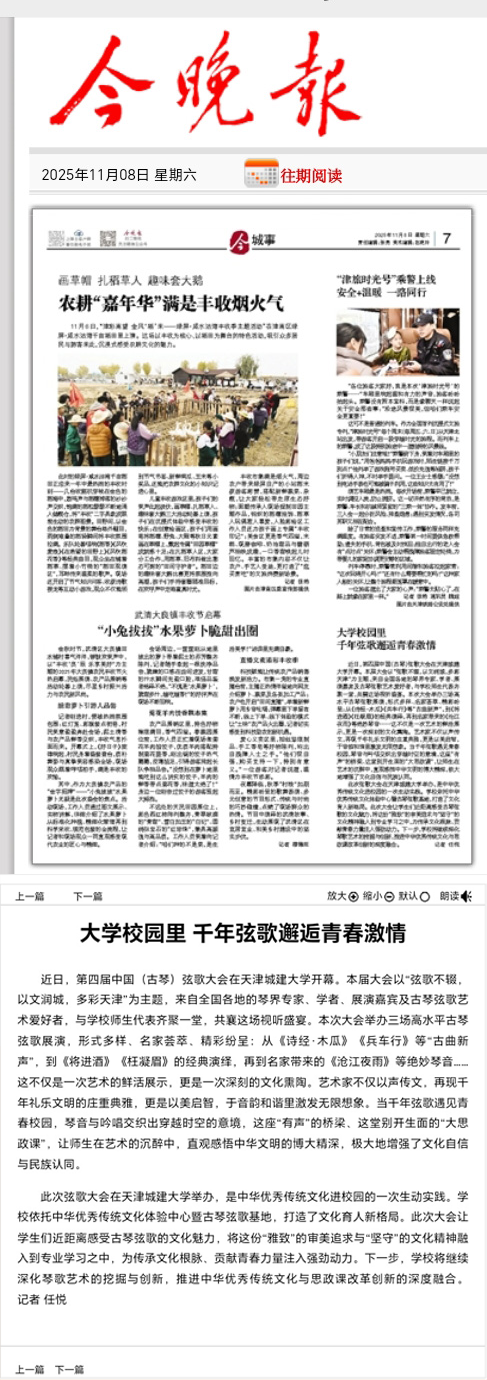 10月24日-25日,第四届中国(古琴)弦歌大会在伟德官网隆重召开。全国古琴名家与展演人员齐聚一堂,为学校师生带来一场沉浸式的视听盛宴。琴音与吟唱交织出穿越时空的意境,让师生们在艺术的熏陶中,零距离感受中华优秀传统文化的深邃与魅力。活动现场反响热烈,受到了人民日报、光明日报、中国日报、中国教育报、天津教育报、中国新闻网、津门网络大思政等多家媒体宣传报道。