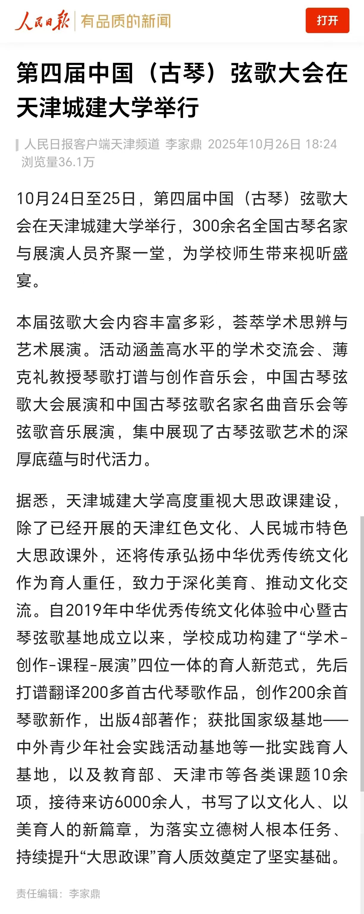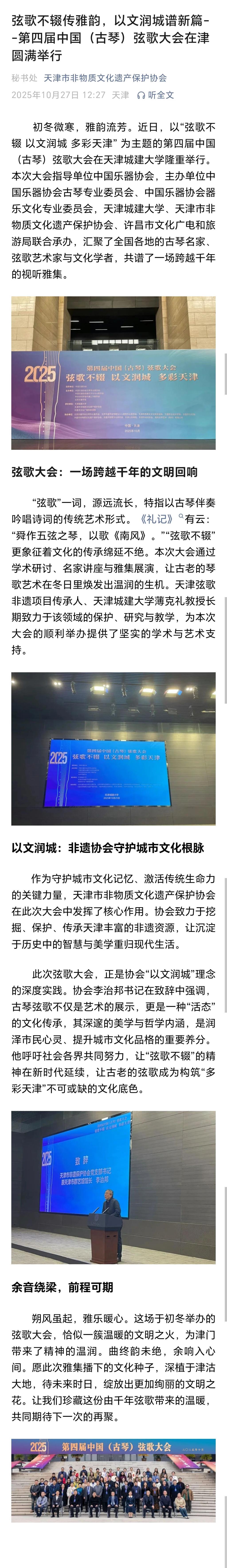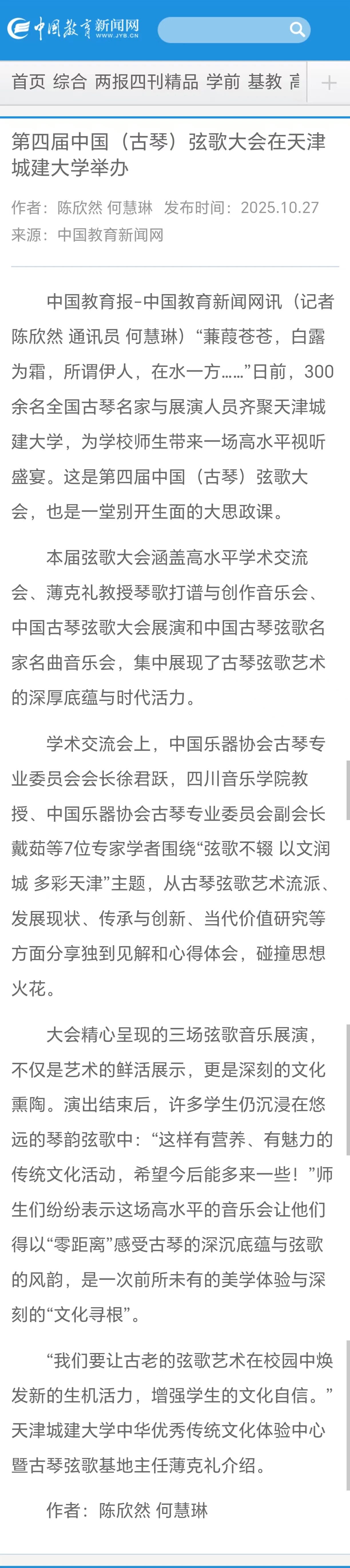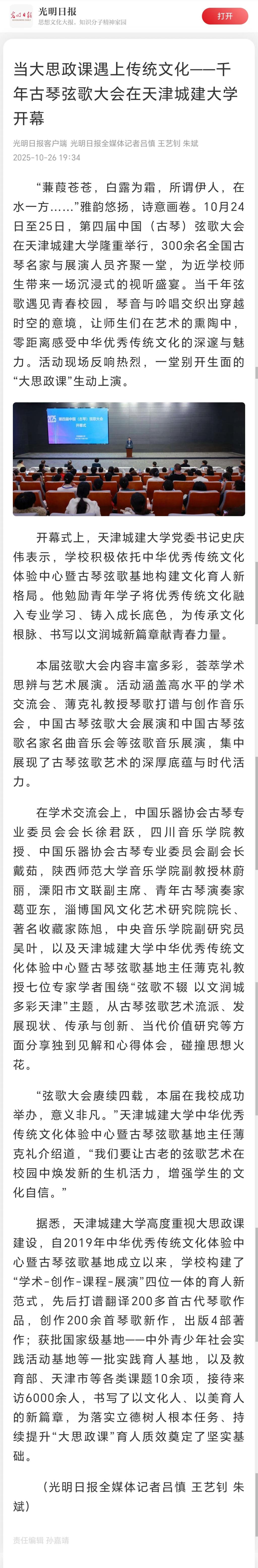10月24日-25日,第四届中国(古琴)弦歌大会在伟德官网隆重召开。全国古琴名家与展演人员齐聚一堂,为学校师生带来一场沉浸式的视听盛宴。琴音与吟唱交织出穿越时空的意境,让师生们在艺术的熏陶中,零距离感受中华优秀传统文化的深邃与魅力。活动现场反响热烈,受到了人民日报、光明日报、中国日报、中国教育报、天津教育报、中国新闻网、津门网络大思政等多家媒体宣传报道。