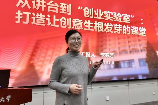 2023年度天津市创业金课课题组成员李芬芳以《从讲台到“创业实验室”:打造让创意生根发芽的课堂》为题,分享了她在创业管理课程教学中的探索。通过“学生身份重构”“教师角色升级”“课堂场域重塑”三个维度,介绍了如何利用自我认知训练、创意生成训练、商业模式画布等工具,引导学生从被动接受转向主动创造,并将校友创业案例引入课堂,增强教学的真实性与感染力。