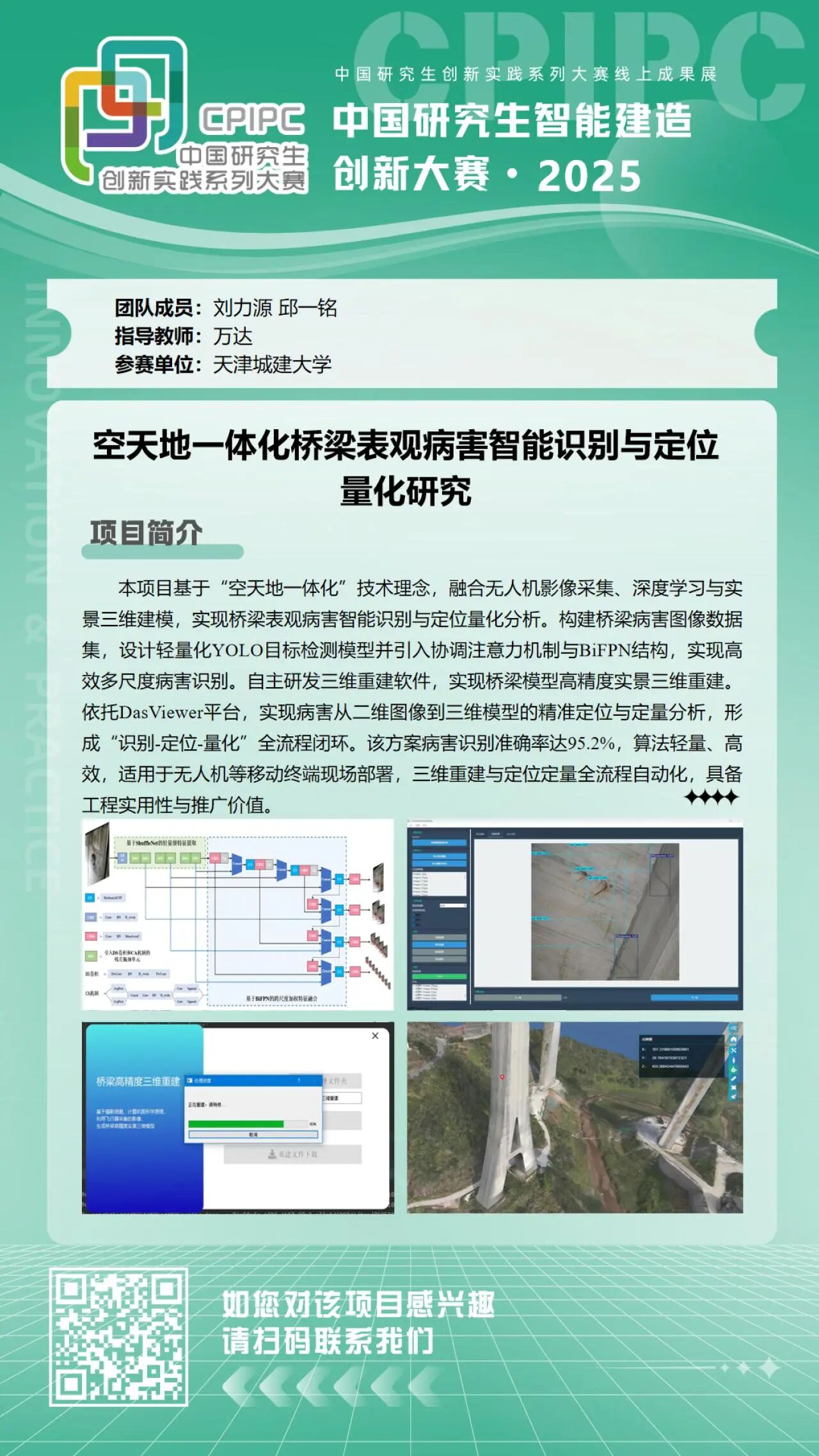 团队针对桥梁表面病害识别中存在的效率低、定位难、量化精度不足等现实问题,设计了一套“数据采集-三维重建-智能识别-精准量化”的一体化技术流程,通过无人机采集桥梁表观高清图像,自主构建并标注了涵盖裂缝、剥落、锈蚀等典型病害的数据集,在此基础上训练出轻量化识别模型,在保证识别精度的同时,显著降低了计算资源需求,为现场移动化部署提供了可能。