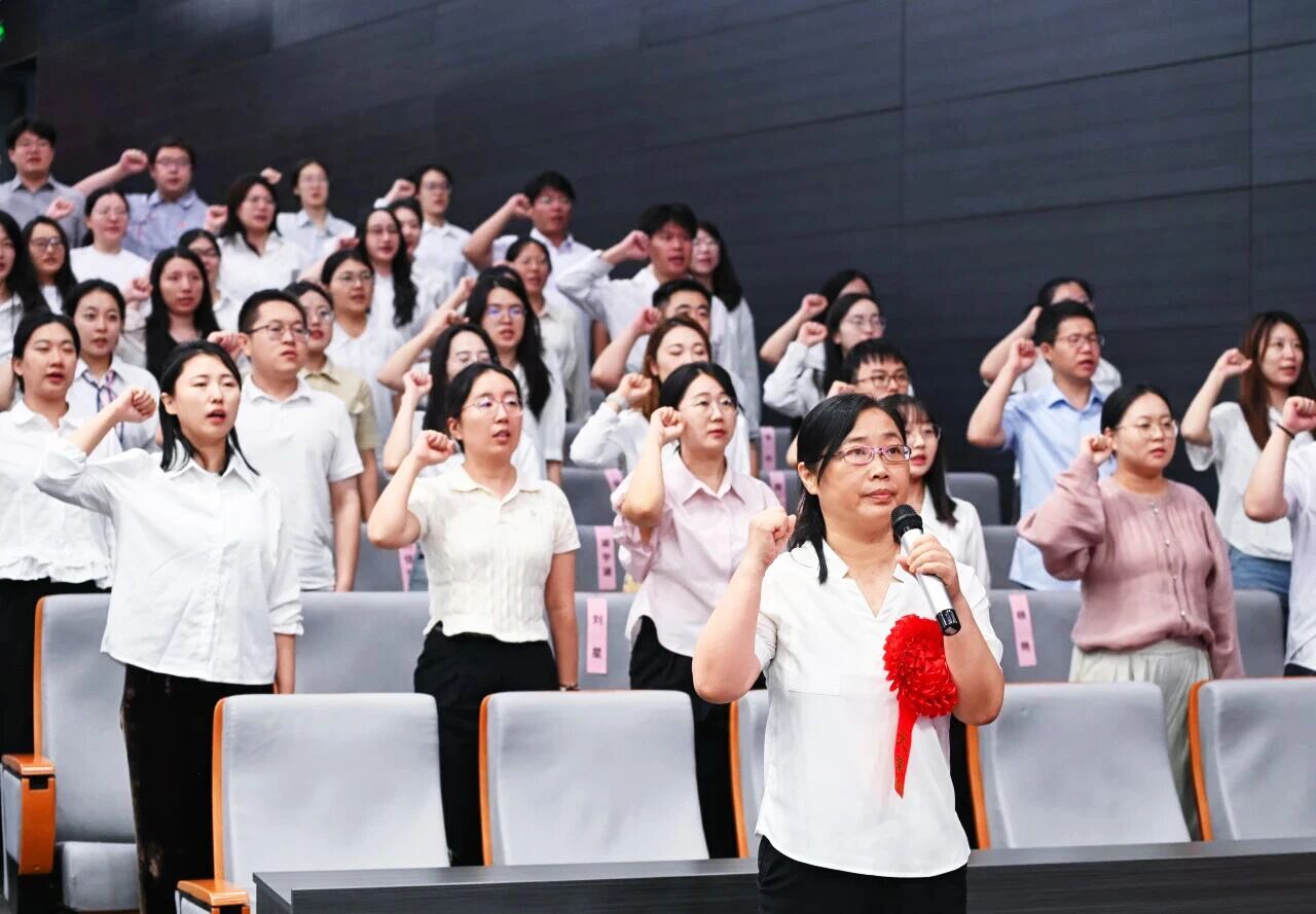 全体新入职教职工面向国旗庄严宣誓,铿锵有力的誓言回荡现场。一句句誓词掷地有声,既是他们对教师职业的庄严敬畏,更是彰显了他们对教育事业的无限热爱。