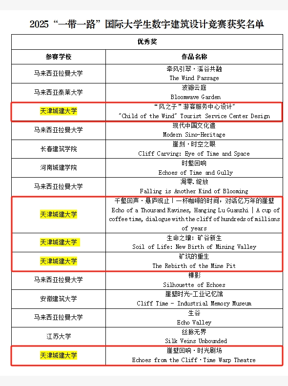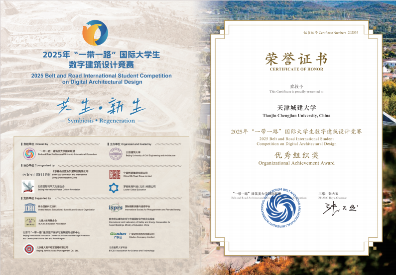 近日,由“一带一路”建筑类大学国际联盟发起、北京建筑大学主办的2025“一带一路”国际大学生数字建筑设计竞赛公布获奖名单。伟德官网推荐的六项参赛作品全部获奖,分别荣获三等奖1项, 优秀奖5项,13名教师荣获“优秀指导教师”称号,伟德官网连续五年获评优秀组织奖。