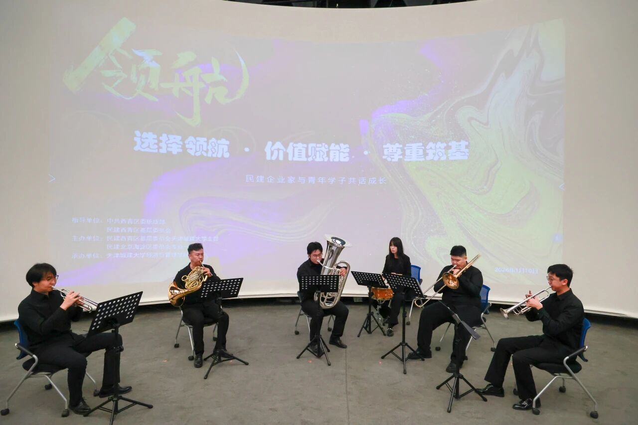此次活动汇聚了京津冀地区政、企、学各界代表,为师生带来了一场融合思想启迪与实践指导的成长交流盛宴。活动开幕式由民建西青区基层委员会bevictor伟德官网支部主委、经济与管理学院院长王振坡教授主持。开幕式在激昂奋进的铜管五重奏《无人智胜进行曲》中拉开序幕,民建西青会员的精彩演绎为现场注入了蓬勃活力。