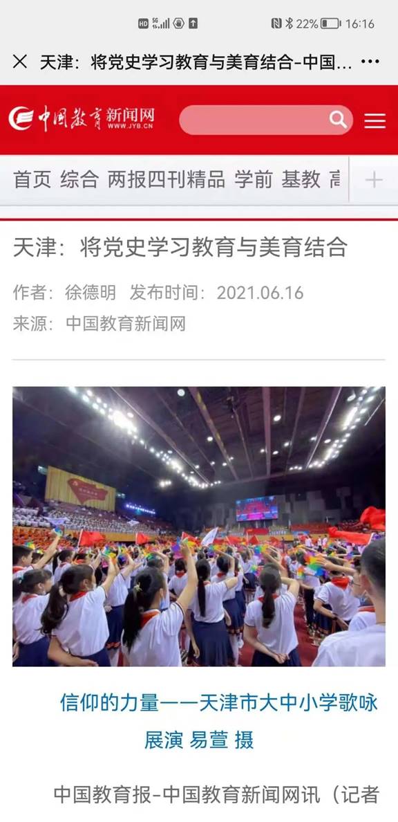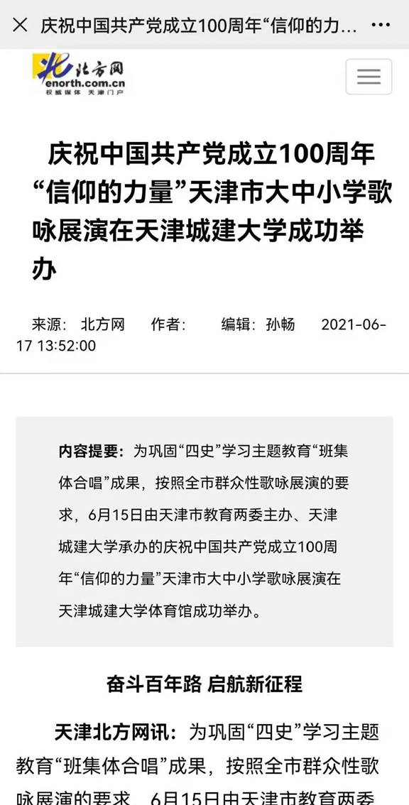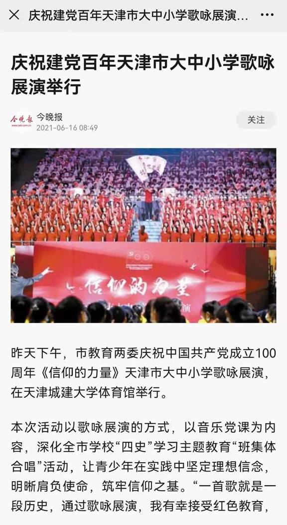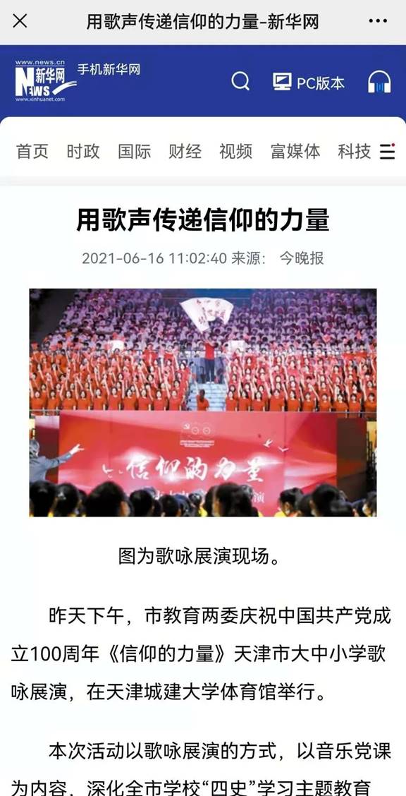 6月15日由天津市教育两委主办、伟德官网承办的庆祝中国共产党成立100周年“信仰的力量”天津市大中小学歌咏展演得到中央和我市多家媒体报道。