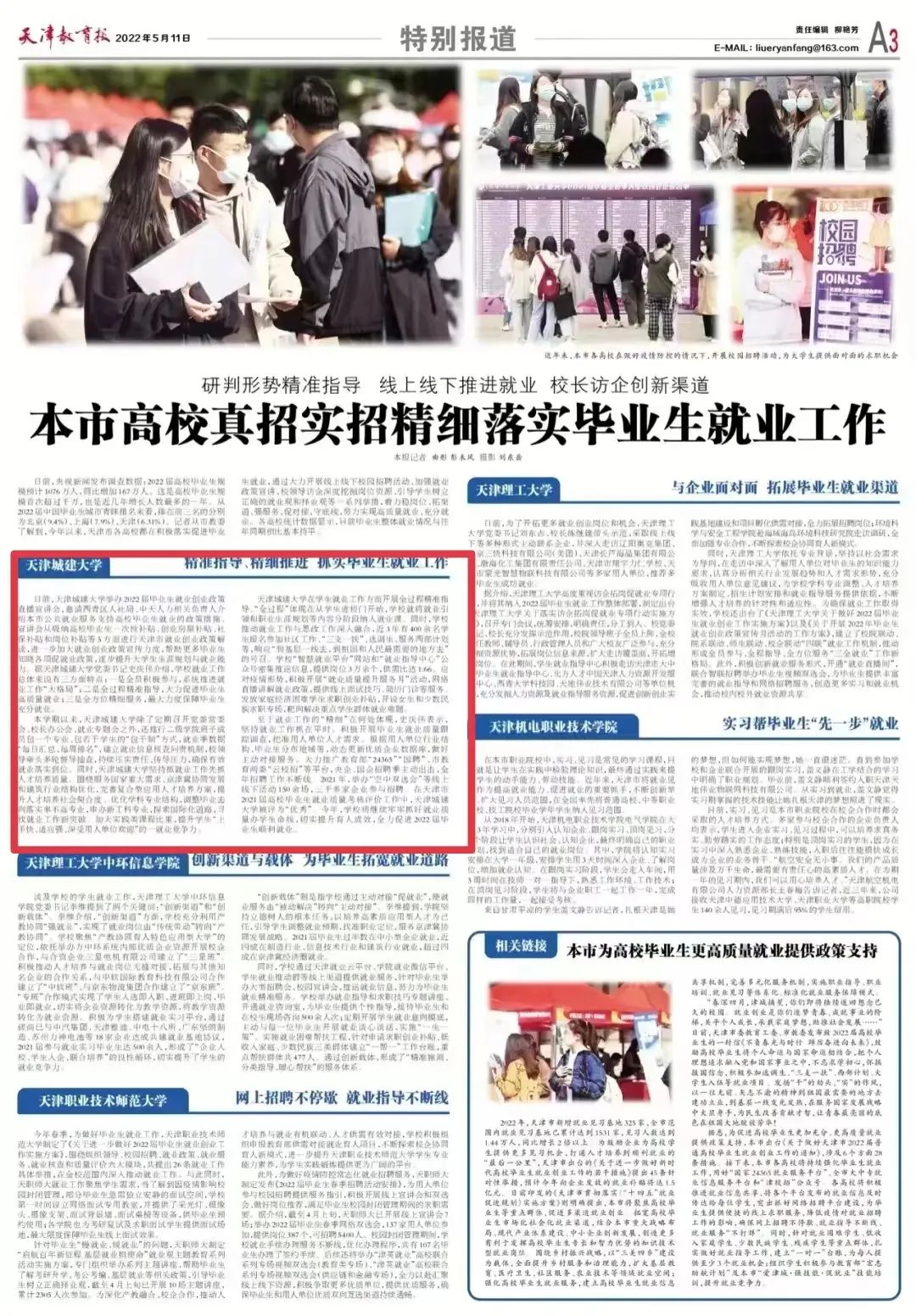 5月11日,《天津教育报》A3版以“精准指导、精细推进 抓实毕业生就业工作”为题报道了伟德官网就业工作典型经验。