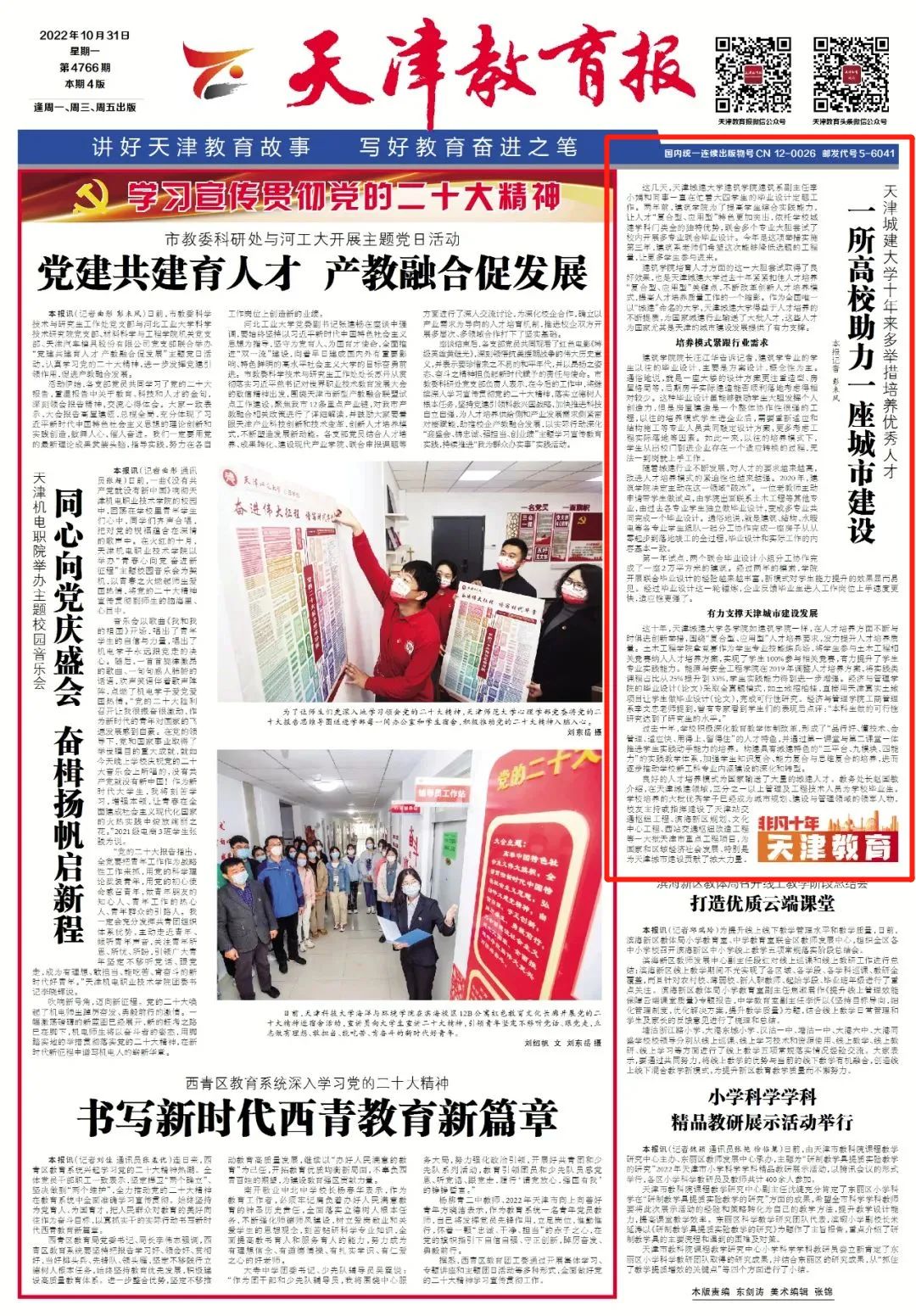 10月31日出版的《天津教育报》以“bevictor伟德官网十年来多举措培养优秀人才——一所高校助力一座城市建设”为题对伟德官网工作进行报道。原文如下。