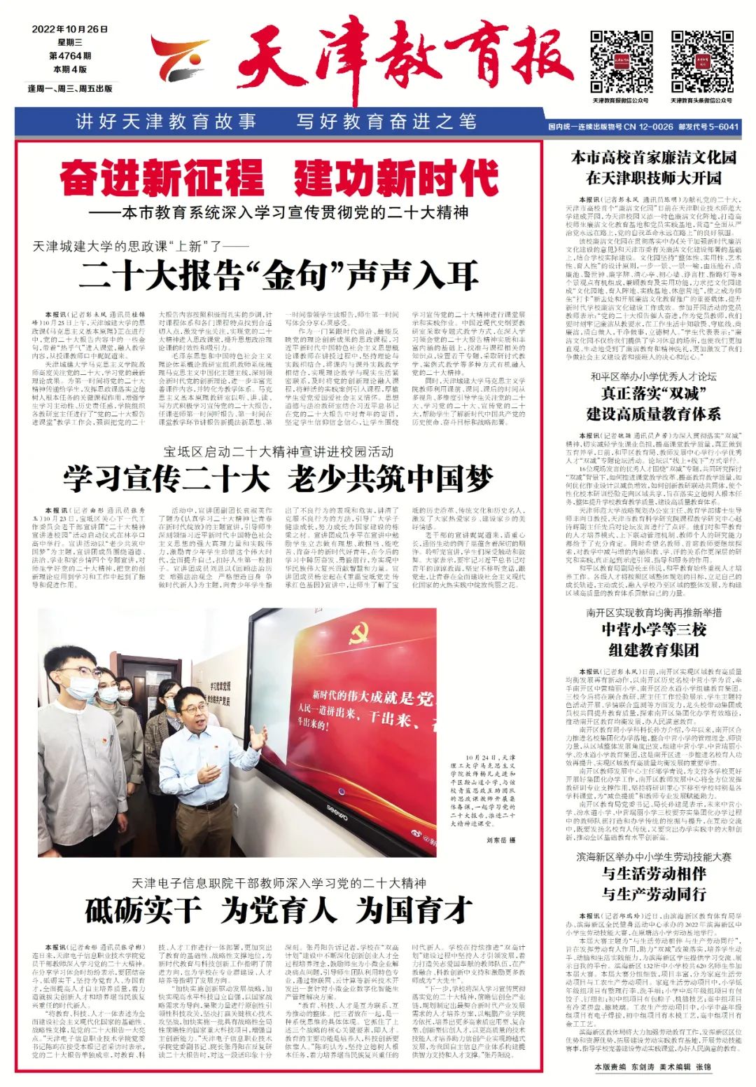 10月26日出版的《天津教育报》以“bevictor伟德官网的思政课‘上新’了——二十大报告‘金句’声声入耳”为题对伟德官网学习宣传贯彻党的二十大精神进行报道。原文如下。
