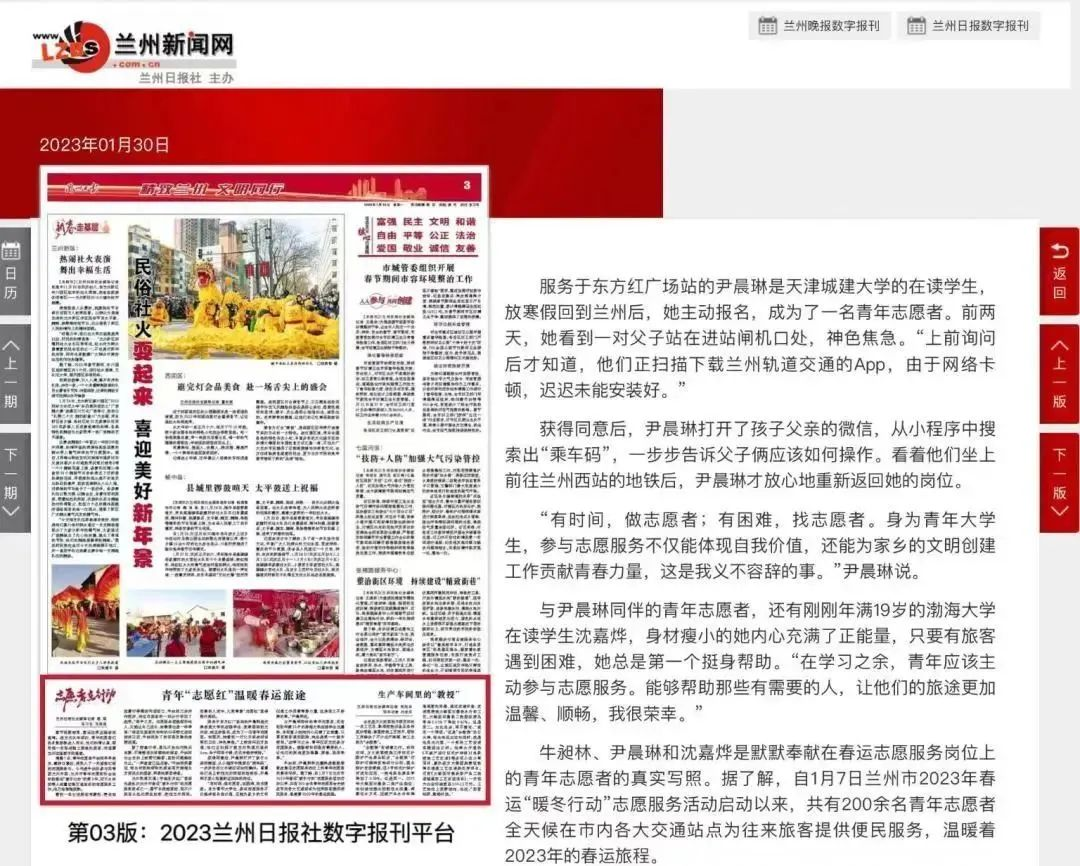 近日,《兰州日报》报道伟德官网外国语学院学子尹晨琳积极参与家乡兰州"暖冬行动"志愿服务活动的事迹。尹晨琳和她的志愿者小伙伴不畏严寒,主动投身家乡春运志愿服务活动,在兰州轨道交通1号线东方红广场站,为节后返程复工的旅客提供便民服务,他们热情、贴心的帮助赢得了旅客的赞誉。具体如下:
