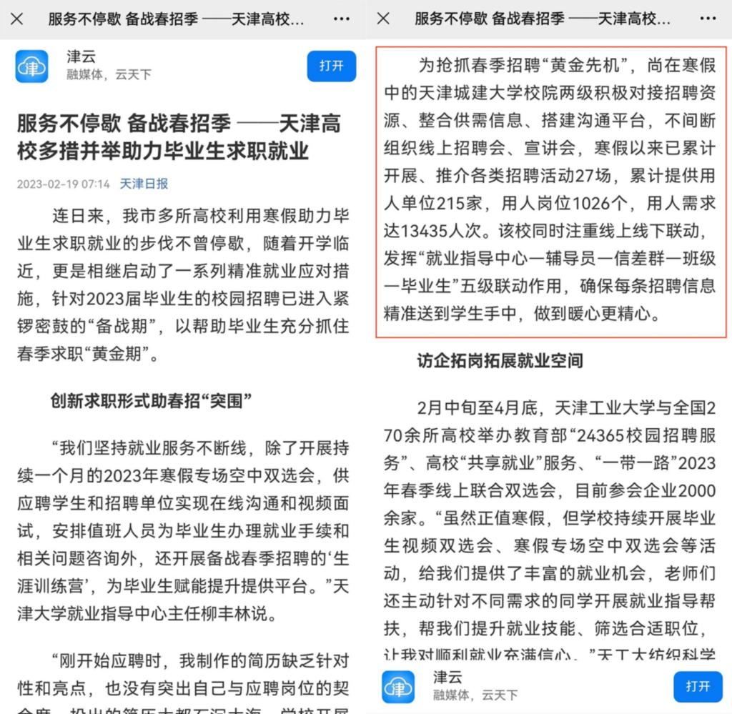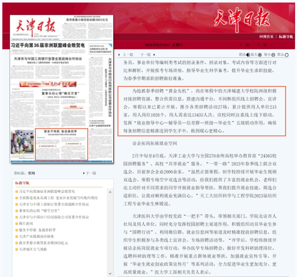 2月19日,《天津日报》、津云客户端以《服务不停歇备战春招季》为题报道了我市多所高校多措并举助力毕业生求职就业的典型案例。其中,对伟德官网寒假暖心就业服务不断线工作进行报道。具体如下: