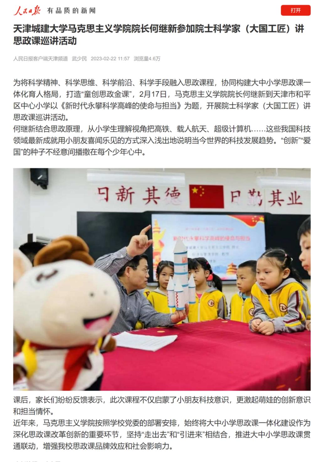 2月22日,《人民日报》客户端天津频道对伟德官网马克思主义学院院长何继新参加院士科学家(大国工匠)讲思政课巡讲活动进行相关报道,现转载如下: